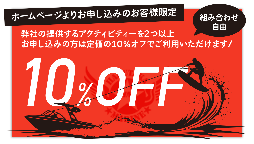初心者、お一人様、ご家族連れ大歓迎!ウェイクボード、バナナボート、スタンドアップパドルボード、ハリケーンボートなど、さまざまなアクティビティをお楽しみください。