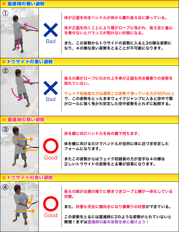 3.体勢はリラックスした姿勢でハンドルを腰にキープ、体を倒さないように進入(体を倒しこむとロープの張りがきつくなり腰にキープするのが困難になります)