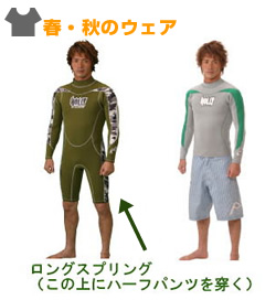 春と秋にはロングスプリング(通称「ロンスプ」とか「ロンスリ」と呼ばれています)というウェットスーツがお勧めです。(夏でも使用できるので最も使用されているウェットスーツでもあります)